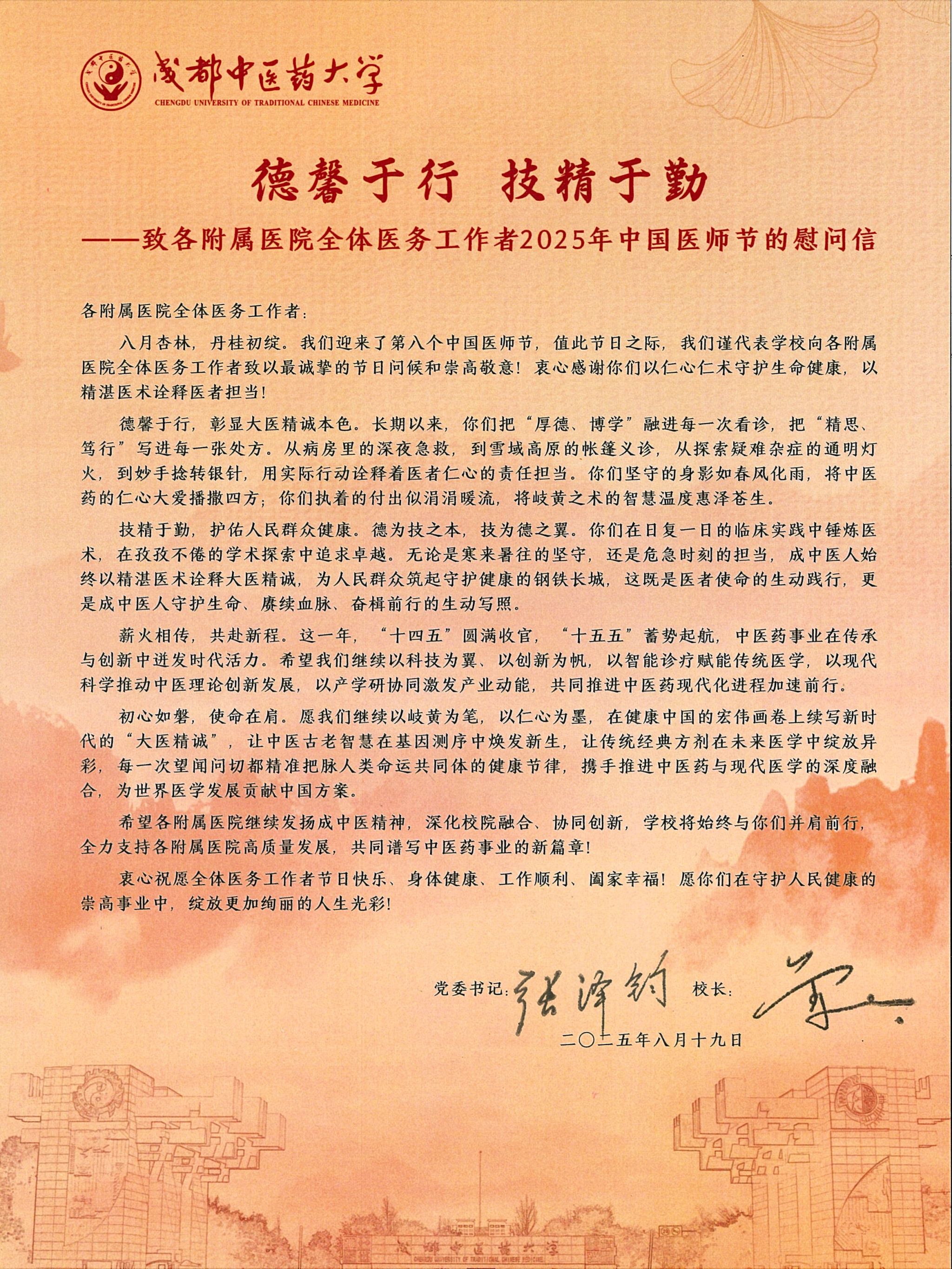 致全体医务工作者2025年中国医师节的慰问信 发布时间:2025-08-18 10:40:57 浏览次数: 次 【字体:小 大】 【打印正文】 上一条:喜讯!我校首次上榜世界大学学术排名(ARWU)榜单 下一条:天府永安湖实验室组建方案通过专家论证