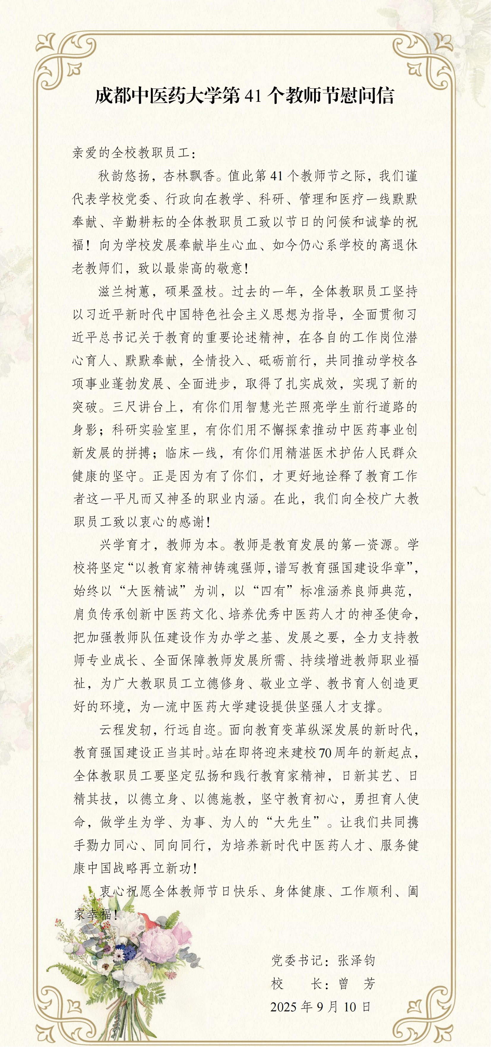 成都中医药大学第41个教师节慰问信 发布时间:2025-09-10 14:51:04 浏览次数: 次 【字体:小 大】 【打印正文】 上一条:2025年全球前2%顶尖科学家榜单发布 我校入选学者人数再创新高 下一条:我校隆重举行2025级新生开学典礼