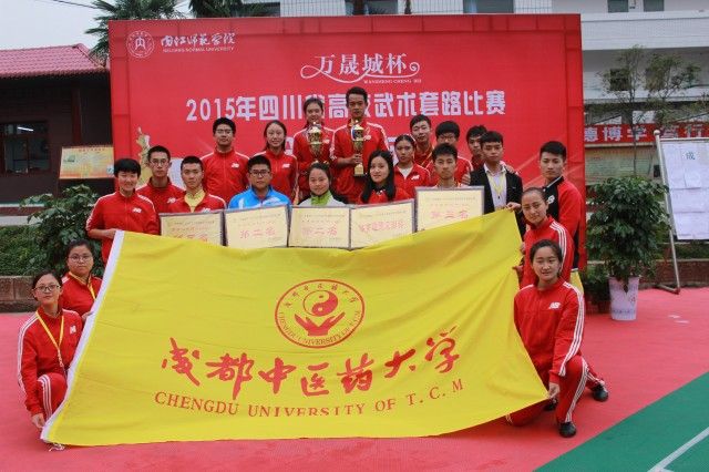 按照规程要求每一所学校只能参加两个组别的比赛,我校没有派出学校高水平运动队参加比赛,只选派了由体育专业学生和针灸、临床专业组成的体育专业(甲组)和普通学生(乙组)两支代表队。我校队员在比赛中顽强拼搏,一举夺得9枚金牌,11枚银牌,5枚铜牌,甲组团体总分一等奖,乙组二等奖和体育道德风尚奖等优异成绩,展示我校武术运动的普及水平和成都中医药大学学生的精神风貌。