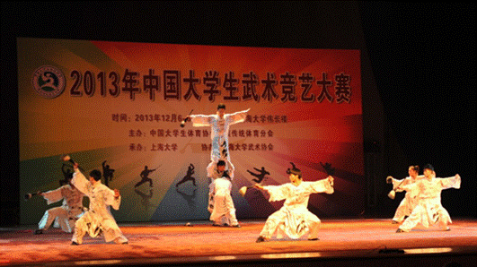 由中国大学生体育协会民族传统体育分会主办、上海大学承办的2013年中国大学生武术“竞艺”大赛日前在上海大学圆满结束。来自复旦大学、浙江大学、华东理工大学、西北师范大学、天津理工大学、北京体育大学、华中科技大学、集美大学、成都中医药大学等全国十七所高校的200多名运动员参加了比赛。经过激烈的预赛和决赛,我校武术队参赛的节目《墨功》荣获铜奖。