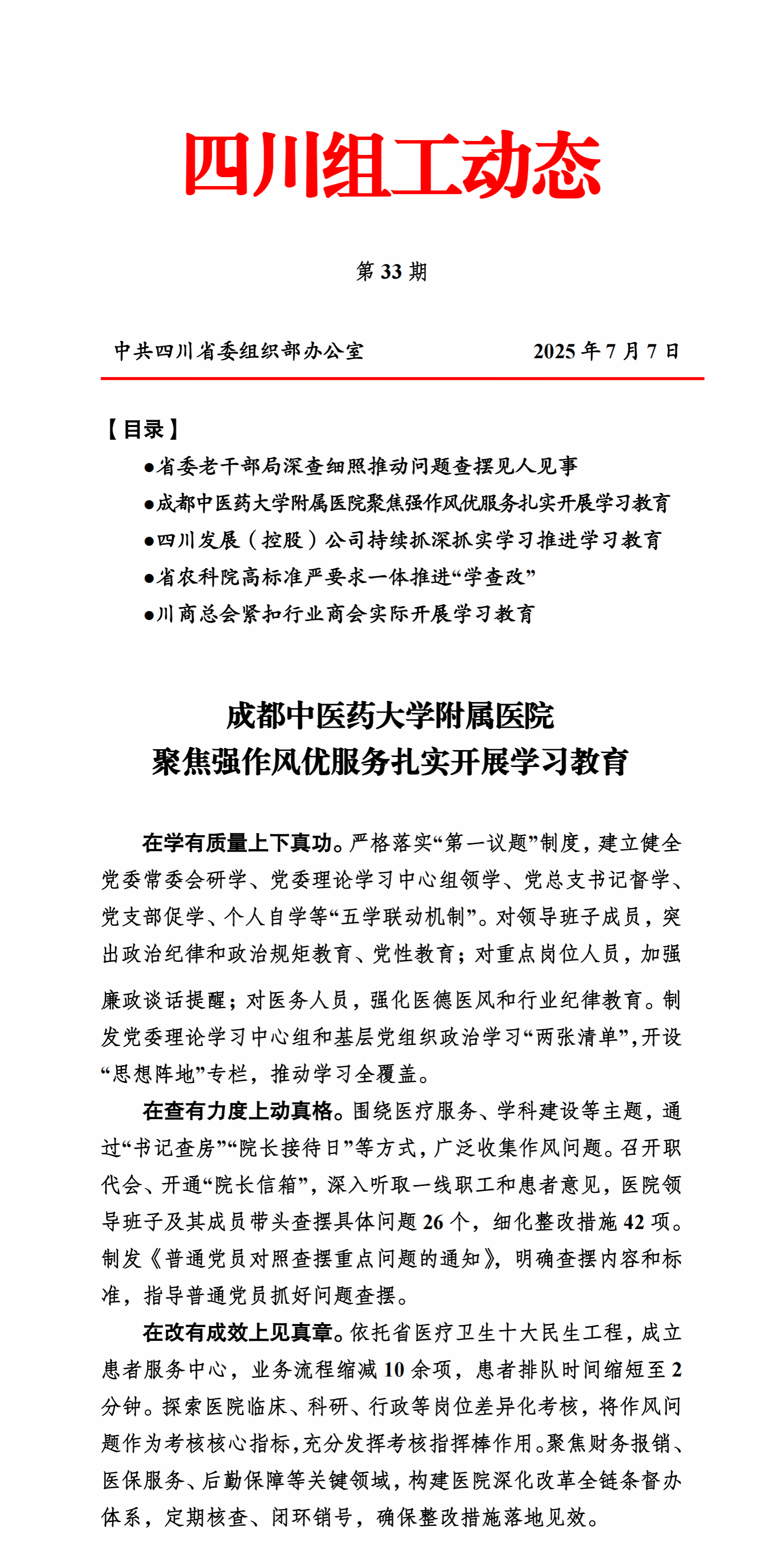 成中医经验|《四川组工动态》刊登我校附属医院学习教育工作做法 发布时间:2025-07-11 21:57:04 浏览次数: 次 【字体:小 大】 7月7日,《四川组工动态》第33期刊登了我校附属医院学习教育的工作经验——成都中医药大学附属医院聚焦强作风优服务扎实开展学习教育。 【打印正文】 上一条:我校社科联获评全国先进社科类社会组织 下一条:学校召开党委常委会会议学习贯彻习近平总书记重要文章精神研究部署贯彻落实意见