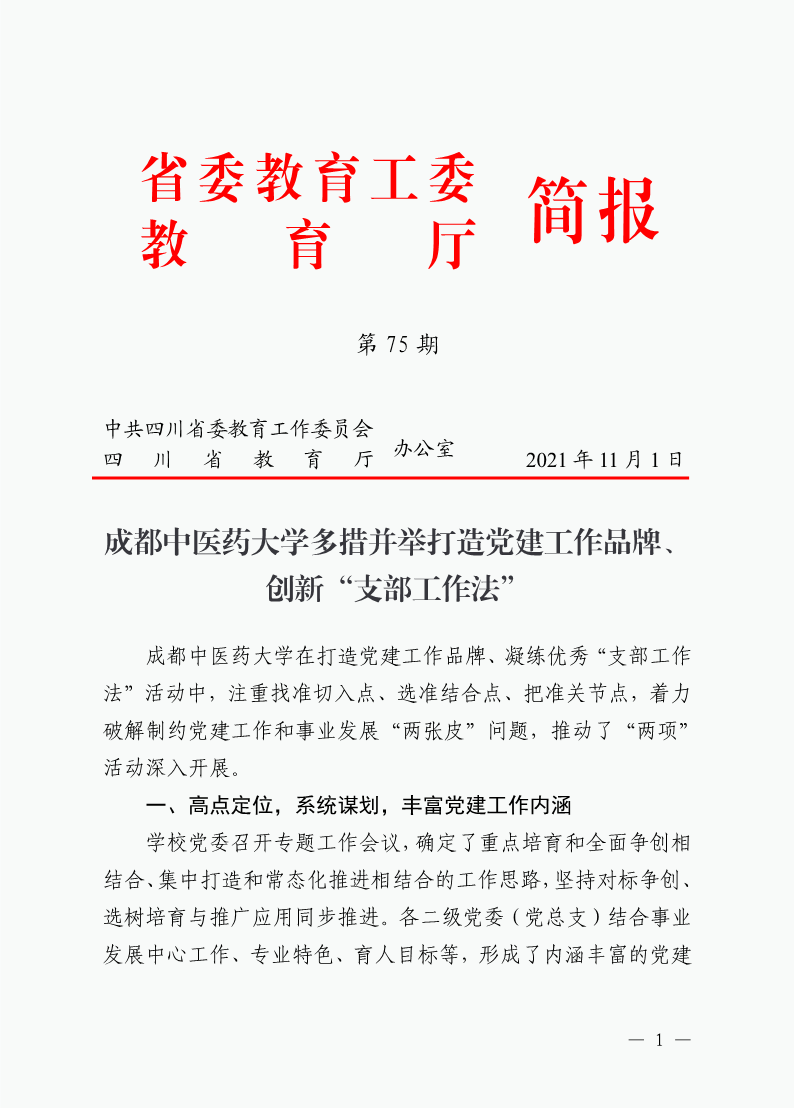 近日,成都中医药大学积极创建党建工作品牌、凝练优秀“支部工作法”,以品牌思维抓党建,以工作法破难题,以党建引领促发展。学校各基层党组织纷纷拿出实招硬招,从校级、院系、支部层面落实。