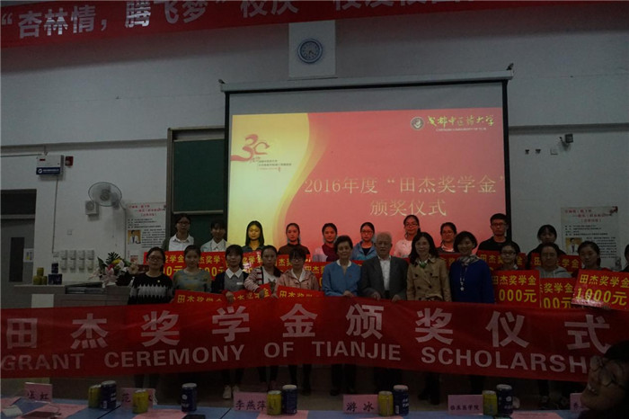 10月24日下午18时,由学校主办、针灸推拿学院/第三附属医院承办的“校庆•校友校园行”名家讲座第十场暨针灸推拿学院/第三附属医院“田杰奖学金”“马里兰州助学金”颁奖仪式在温江校区D107举行。莅临现场的嘉宾、领导和老师有:我校79级杰出校友、“田杰奖学金”创立人田忆芳女士,“马里兰州助学金”中方管理人、四川省十大名医、学院老专家张虹教授,退休教师代表范家永老师,学院党委书记、副院长张俭老师,教师代表李燕萍老师,临床医学院团委书记杜晓娟老师,养生康复学院团委书记冯丽娟老师。参加活动的还有学院辅导员和温江校区全体学生。活动由学院党委副书记杜娟主持。