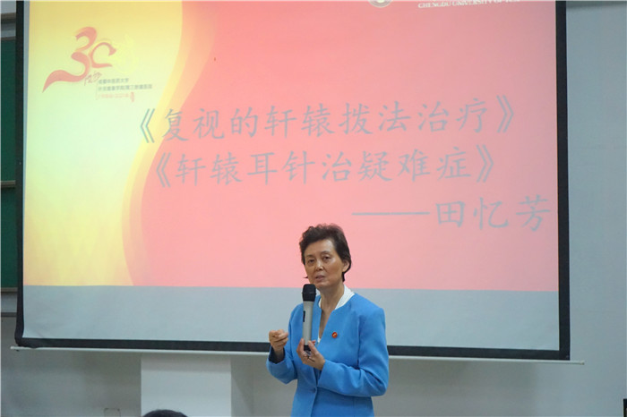 第二阶段是“杏林情,腾飞梦”校友讲座第十场,由田忆芳女士主讲。她以“复视的轩辕拨法治疗”“轩辕耳针治疑难症”为主题,根据其几十年的临床经验以及对《金匮要略》《内经》《难经》等中医针灸理论的潜心研究所创立的轩辕经络体系及50经络辨证论治模式,毫无保留地给同学们详细讲解脾大絡、夹脊脉、督脉之絡脉和冲脉的完整走行图像;揭示耳为诸脉之源,耳穴实质为经脉起点,介绍轩辕耳针辨证论治模式。其中穿插了许多田老师在治病过程中的典型案例和遇到的趣事,生动形象的讲座既让同学们感受到获得知识的乐趣,又让大家更清晰地认识到临床实践对疾病治疗的重要性。田老师还与大家分享了自己的成书经验,和同学们谈到自己从《灵枢》等医典古籍中得到的启发,鼓励大家多多研读医学经典。此外,田老师谈到了自己对中医的独特看法,她认为学习中医的过程是枯燥的,但也正是这份枯燥,才能让人静下心来,持之以恒地努力,最终探寻到中医药文化的精髓并将之发扬光大。最后,田老师回答了同学们提出的问题,让学子们受益匪浅。
