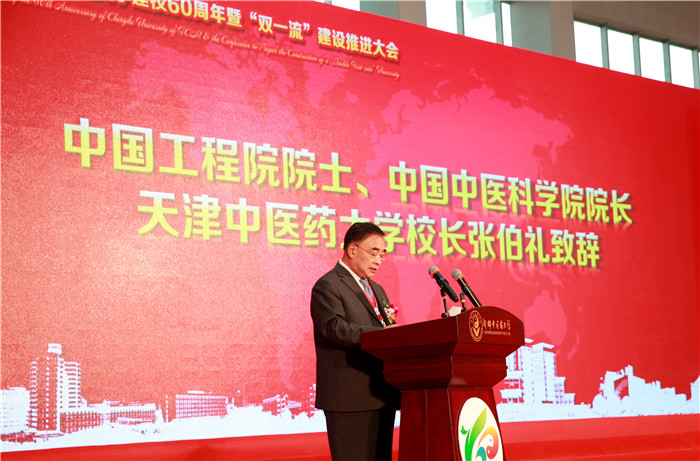 张伯礼代表教育部中医学类教指委,中国中医科学院、天津中医药大学和兄弟院校,向成都中医药大学60华诞表示热烈的祝贺。他说,成都中医药大学坚持优良的办学传统和办学理念,注重科学定位、特色发展,形成了鲜明的办学特色,为中医药事业发展培养输送了大批优秀的高等中医药人才,为国家经济社会发展、科技进步和文化繁荣做出了重要贡献。60周年是成都中医药大学发展历史上的一个重要里程碑,预示着一个崭新的开始。希望成都中医药大学扎实推进世界一流中医药大学和学科建设,在建设健康中国的伟大事业中,砥砺前行,再铸辉煌。