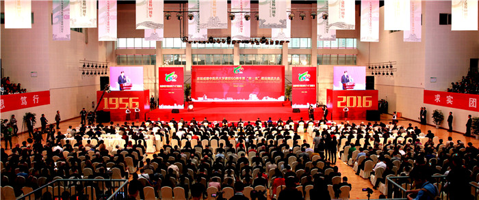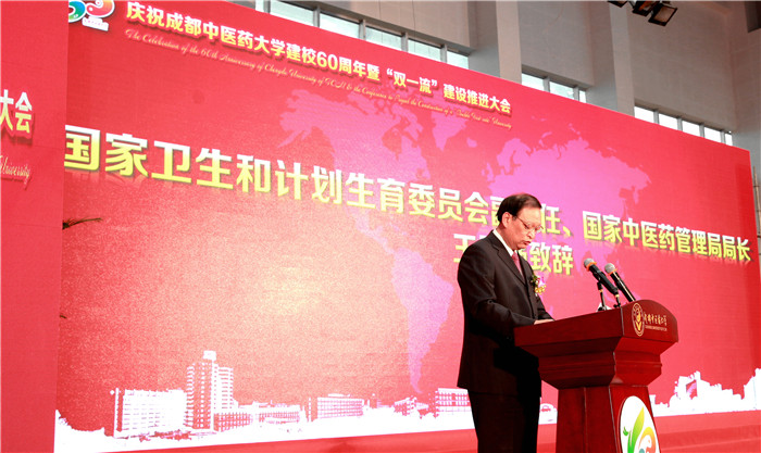 王国强在大会上致辞。他代表国家卫生计生委、国家中医药管理局向成都中医药大学60华诞表示热烈祝贺,向与会的各位专家、来宾表示诚挚的问候,向长期以来高度重视和大力支持中医药事业发展的四川省委省政府和各有关部门表示衷心的感谢。王国强指出,60年前,经国务院批准建立了包括成都中医药大学在内的国内首批四所中医药高等院校,开启了我国高等中医药教育的新纪元。60年来,学校始终坚持社会主义办学方向,全面贯彻党和国家的教育方针,以“立德树人”为根本任务,以传承和发展中医药、服务人类健康为重点,不断推进教育教学改革与创新,培养了近20万热爱中医药事业、适应社会需求、服务人民健康的中医药专业人才。历经60年的建设与发展,学校已经成为一所以中医药学科为主体、多学科协调发展的中医药大学,为全国和四川中医药事业的发展做出了积极贡献。