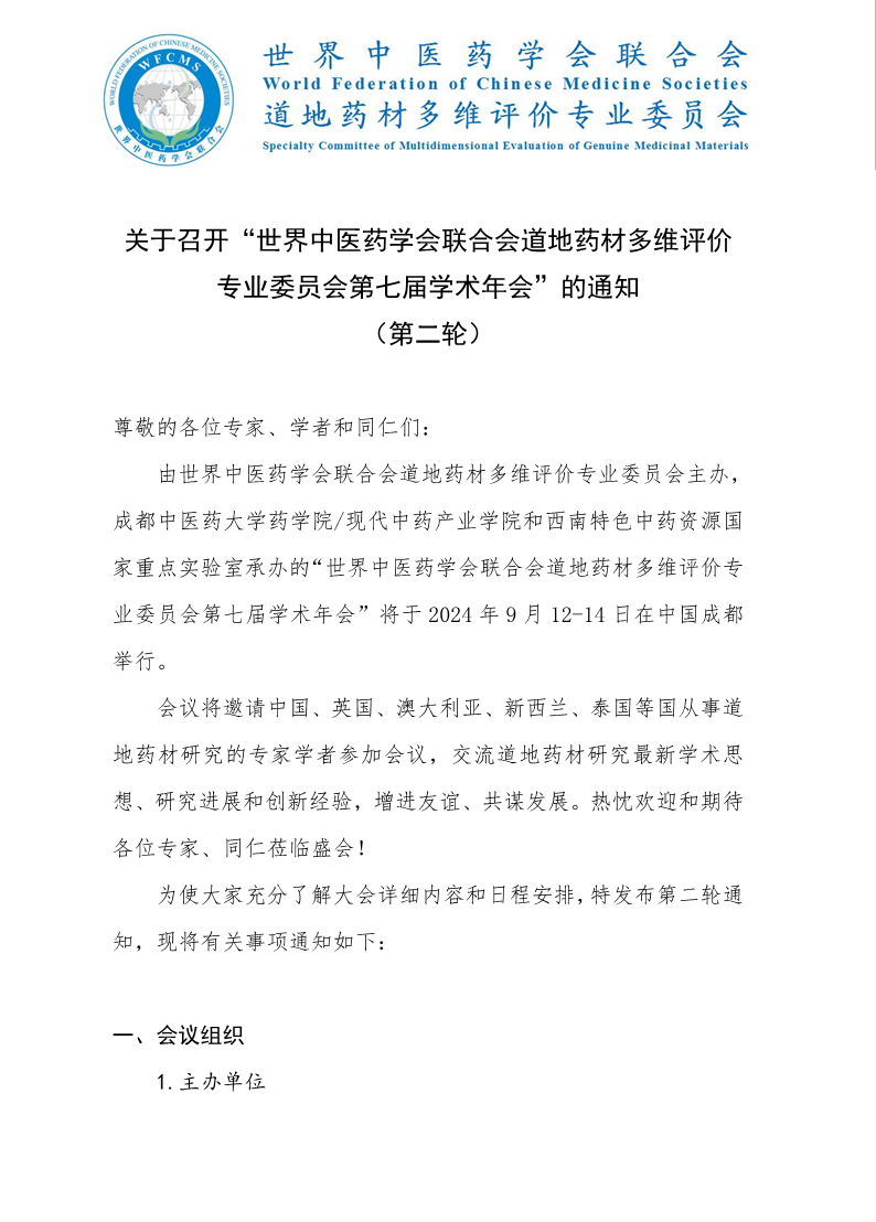 由世界中医药学会联合会道地药材多维评价专业委员会主办,成都中医药大学药学院/现代中药产业学院和西南特色中药资源国家重点实验室承办的“世界中医药学会联合会道地药材多维评价专业委员会第七届学术年会”将于2024年9月12日-14日在四川省成都市温江区召开。大会将邀请国/境内外知名专家做专题报告,同时设有青年学者论坛和壁报征集。敬请同行专家、学者、研究生参会和投稿,共话道地药材现代化蓝图!