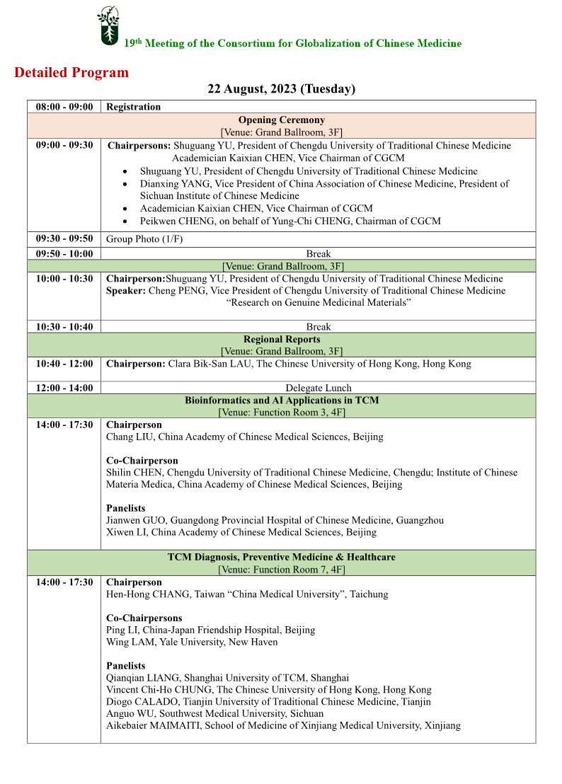 第19届中药全球化联盟(CGCM)会议将于2023年8月21-25日(周一至周五)在成都费尔顿大酒店举行,由成都中医药大学承办。本次会议将为参会者提供一个监管、行业、学术跨领域交流和草药相关领域研究合作的平台。