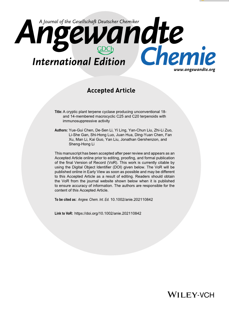 近期,成都中医药大学西南特色中药资源国家重点实验室/中医药创新研究院黎胜红研究团队在国际化学顶级期刊Angewandte Chemie - International Edition(Nature Index,中科院JCR一区)上发表了题为 “A cryptic plant terpene cyclase producing unconventional 18- and 14-membered macrocyclic C25 and C20 terpenoids with immunosuppressive activity”的研究论文。