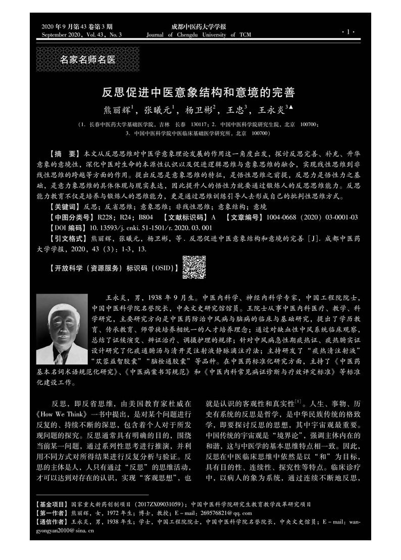 《成都中医药大学学报》于2020年第三期的“名家名师名医”栏目刊登了 2020年首篇院士约稿——《反思促进中医意象结构和意境的完善》,本文由我校省部共建西南特色中药资源国家重点实验室学术委员会主任委员王永炎院士团队发表。本文从反思思维对中医学意象理论发展的作用这一角度出发,从“反思完善动态意象结构的真实合理性”、“反思完善、补充、升华意象的意境性”、“反思思维深化中医对生命本源性的认识”、“反思思维促进实现线性思维到非线性思维的意境跨越”、“反思是意象思维的特征,是悟性思维之前提”、“医案之按语是反思思维的历史痕迹和实践依据”等六个方面围绕“反思思维与中医意象”作出探讨。