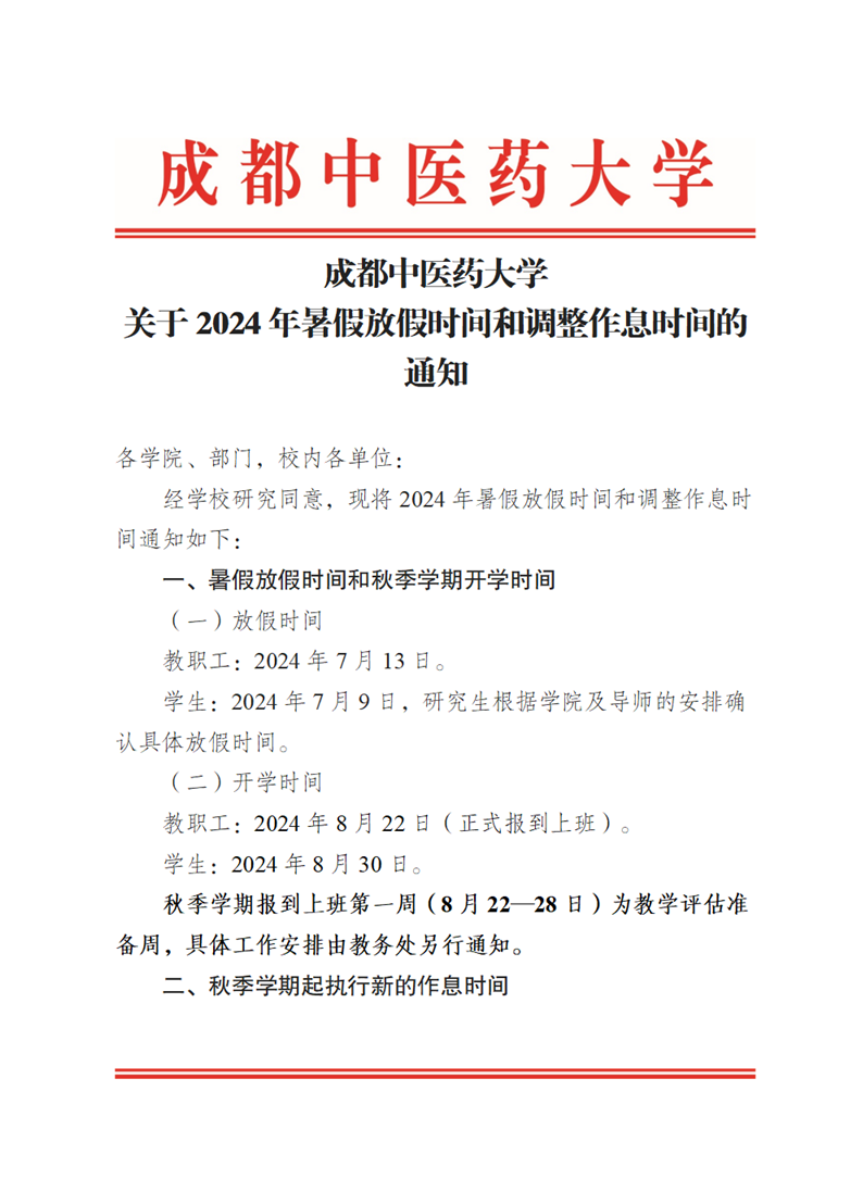 成都中医药大学关于2024年暑假放假时间和调整作息时间的通知 发布时间:2024-06-21 16:27:19 浏览次数: 次 【字体:小 大】 【打印正文】 上一条:成都中医药大学党政办公室关于2024年暑假期间学校管理运行、公共资源开放与服务保障的通告 下一条:成都中医药大学2024年6月招聘辅导员公告