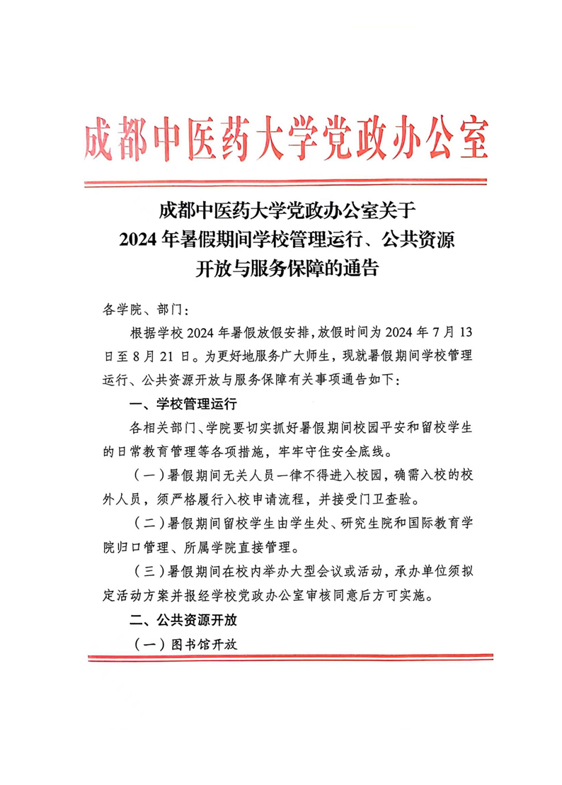 成都中医药大学党政办公室关于2024年暑假期间学校管理运行、公共资源开放与服务保障的通告 发布时间:2024-07-11 15:53:07 浏览次数: 次 【字体:小 大】 【打印正文】 上一条:关于学校公共资源开放与服务保障时间调整的通知 下一条:成都中医药大学关于2024年暑假放假时间和调整作息时间的通知