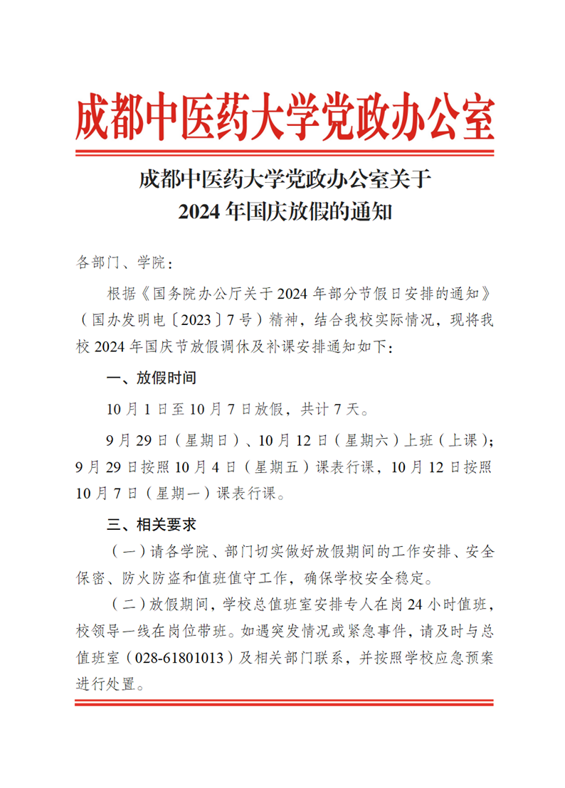 成都中医药大学党政办公室关于2024年国庆放假的通知 发布时间:2024-09-23 11:13:19 浏览次数: 次 【字体:小 大】 【打印正文】 上一条:成都中医药大学党政办公室关于2025年元旦放假的通知 下一条:关于进行防空警报试鸣演练的通知