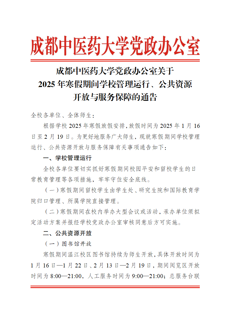 成都中医药大学党政办公室关于2025年寒假期间学校管理运行、公共资源开放与服务保障的通告 发布时间:2025-01-15 16:44:29 浏览次数: 次 【字体:小 大】 【打印正文】 上一条:中共成都中医药大学委员会 成都中医药大学关于印发《成都中医药大学2025年工作要点》和《成都中医药大学2024年工作总结》的通知 下一条:成都中医药大学关于2025年寒假放假时间的通知