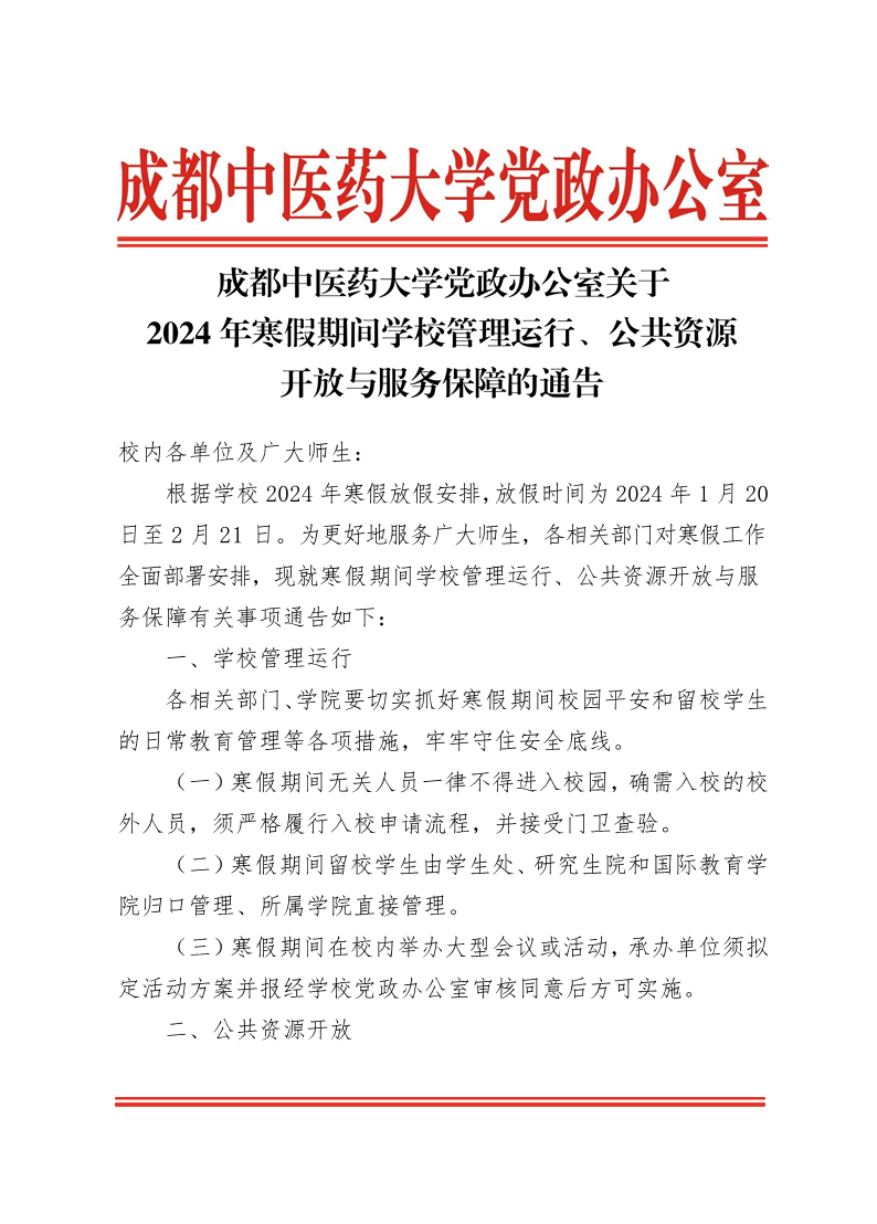 成都中医药大学党政办公室关于2024年寒假期间学校管理运行、公共资源开放与服务保障的通告 发布时间:2024-01-19 17:31:01 浏览次数: 次 【字体:小 大】 【打印正文】 上一条:成都中医药大学劳务派遣服务采购项目 竞争性磋商采购公告 下一条:成都中医药大学关于2024年寒假放假安排的通知
