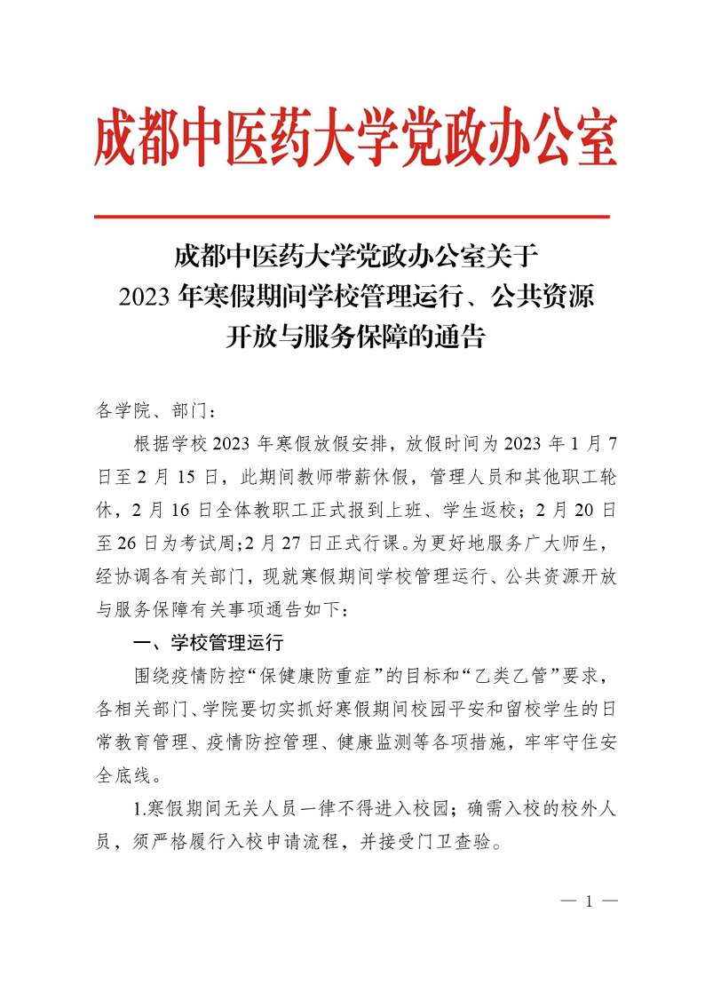成都中医药大学党政办公室关于2023年寒假期间学校管理运行、公共资源开放与服务保障的通告 发布时间:2023-01-09 21:03:19 浏览次数: 次 【字体:小 大】 【打印正文】 上一条:成都中医药大学关于与21家单位开展高等学历继续教育校外教学点合作办学的公示 下一条:成都中医药大学第二附属医院信息化软件市场调研公告