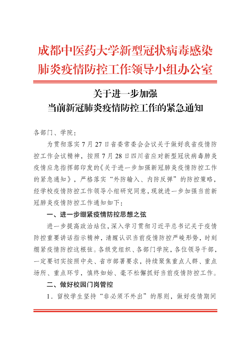 关于进一步加强当前新冠肺炎疫情防控工作的紧急通知 发布时间:2021-07-28 19:13:58 浏览次数: 次 【字体:小 大】 【打印正文】 上一条:成都中医药大学2021年秋季学期开学新冠肺炎疫情防控工作方案 下一条:中共成都中医药大学委员会关于余井权职务任免的通知