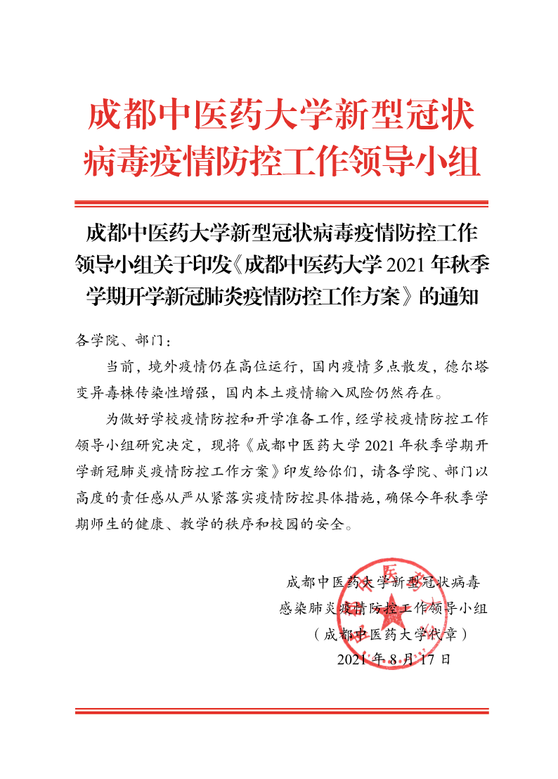 成都中医药大学2021年秋季学期开学新冠肺炎疫情防控工作方案 发布时间:2021-08-17 13:16:45 浏览次数: 次 【字体:小 大】 【打印正文】 上一条:成都中医药大学关于2021级新生报到工作的公告 下一条:关于进一步加强当前新冠肺炎疫情防控工作的紧急通知