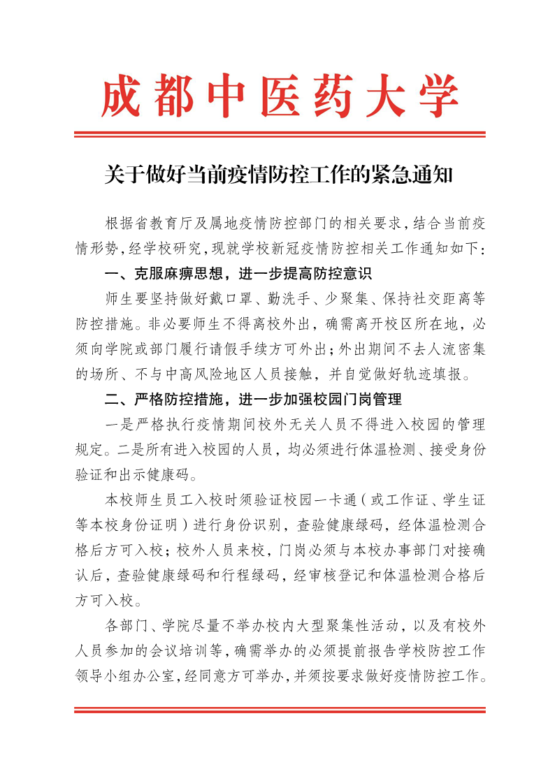 关于做好当前疫情防控工作的紧急通知 发布时间:2020-12-08 18:21:22 浏览次数: 次 【字体:小 大】 【打印正文】 上一条:成都中医药大学2021年招聘博士师资公告(第一批) 下一条:关于启动学校中层副职领导岗位补充工作的通知
