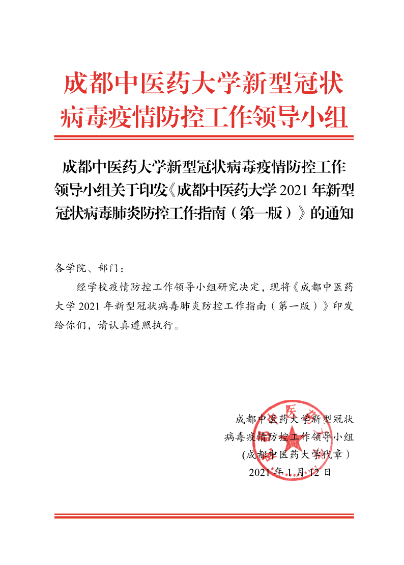 关于印发成都中医药大学2021年新型冠状病毒肺炎防控工作指南(第一版)的通知 发布时间:2021-01-12 18:18:35 浏览次数: 次 【字体:小 大】 【打印正文】 上一条:成都中医药大学2020年度目标管理考核结果公示 下一条:关于选聘部门岗位科级干部面试考评的通知