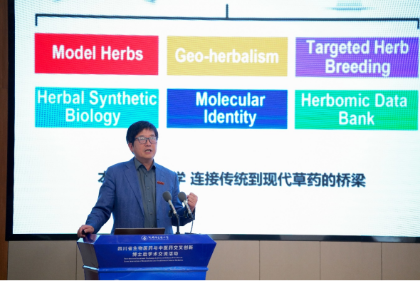 会上,成都中医药大学首席教授、俄罗斯工程院院士、俄罗斯自然科学院院士陈士林做《本草基因组学与中药现代化》主题报告,重点涉及本草基因组学解析中草药遗传背景、辅助分子育种、DNA条形码鉴别中草药物种真伪等方面,阐述将生物学前沿技术与中医药交叉融合解决中医药关键问题的重要性。他还鼓励广大青年学者坚定中医药文化自信,脚踏实地跻身中医药事业。