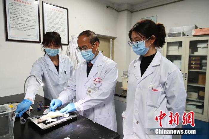 成都中医药大学针灸学首席教授梁繁荣指导学生做动物(小白鼠)实验。中新社记者 安源 摄