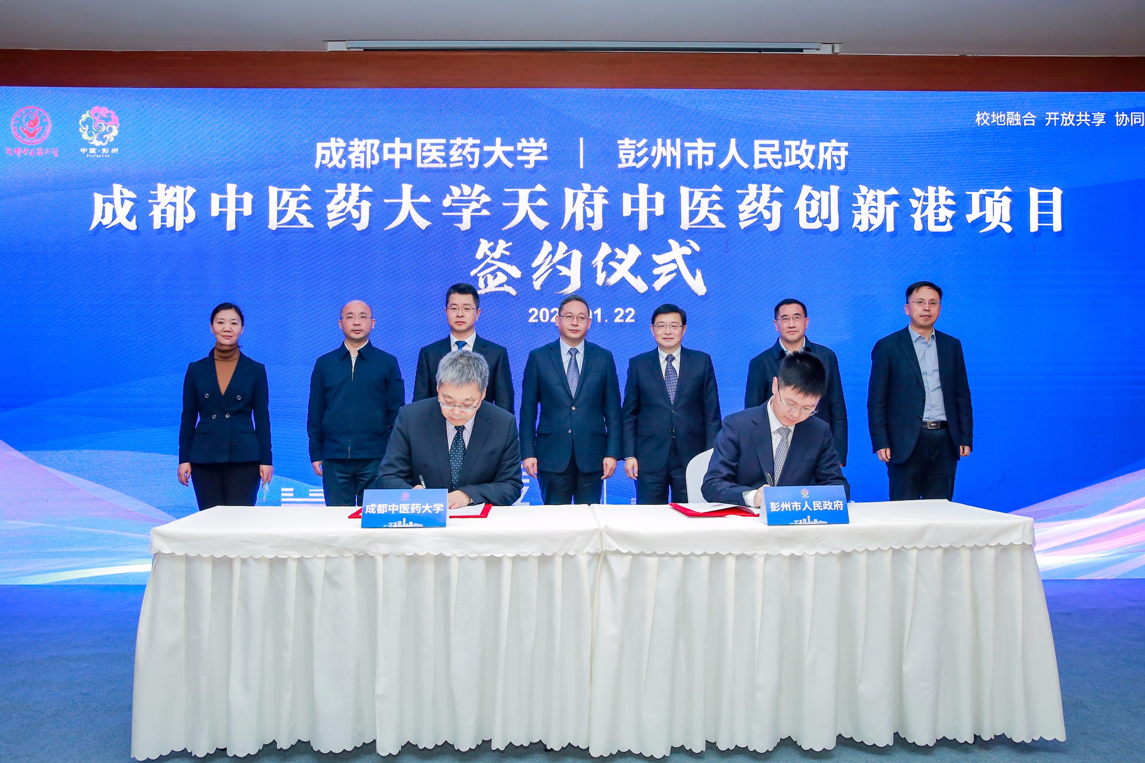 1月22日,由成都中医药大学、彭州市人民政府共同举办的成都中医药大学天府中医药创新港项目签约仪式在成都中医药大学举行。这是为深入贯彻成都市建圈强链行动及促进招商引智优化营商环境行动,整合校地资源协同发展,又一重磅项目。