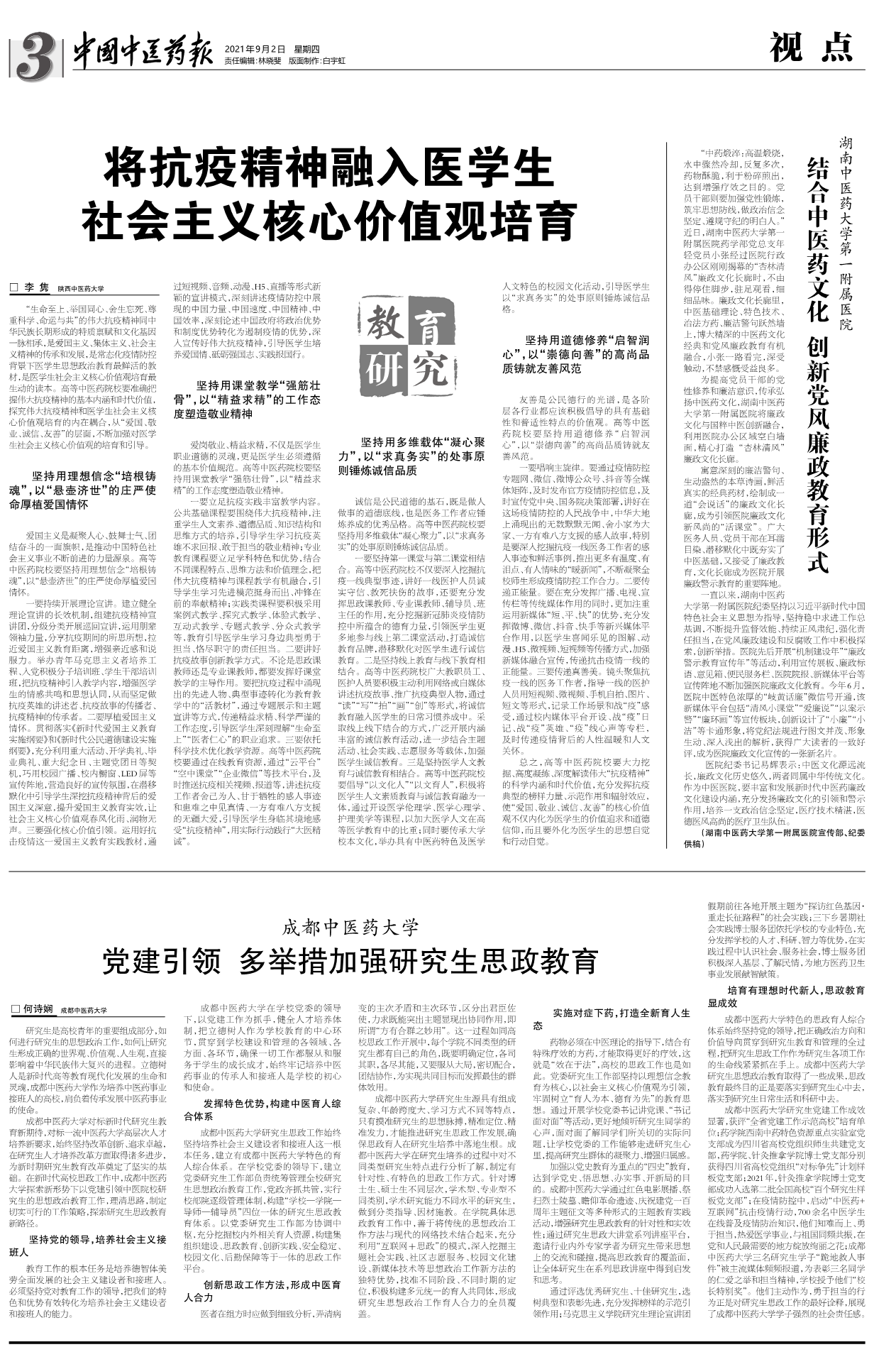 成都中医药大学研究生党建工作成效显著,获评“全省党建工作示范高校”培育单位;药学院西南中药特色资源重点实验室党支部成为四川省高校党组织师生共建党支部,药学院、针灸推拿学院博士党支部分别获得四川省高校党组织“对标争先”计划样板党支部;2021年,针灸推拿学院博士党支部成功入选第二批全国高校“百个研究生样板党支部”;在疫情防控中,启动“中医药+互联网”抗击疫情行动,700余名中医学生在线普及疫情防治知识,他们知难而上、勇于担当,热爱医学事业,与祖国同频共振,在党和人民最需要的地方绽放绚丽之花;成都中医药大学三名研究生学子“跪地救人事件”被主流媒体频频报道,为表彰三名同学的仁爱之举和担当精神,学校授予他们“校长特别奖”。他们主动作为,勇于担当的行为正是对研究生思政工作的最好诠释,展现了成都中医药大学学子强烈的社会责任感。