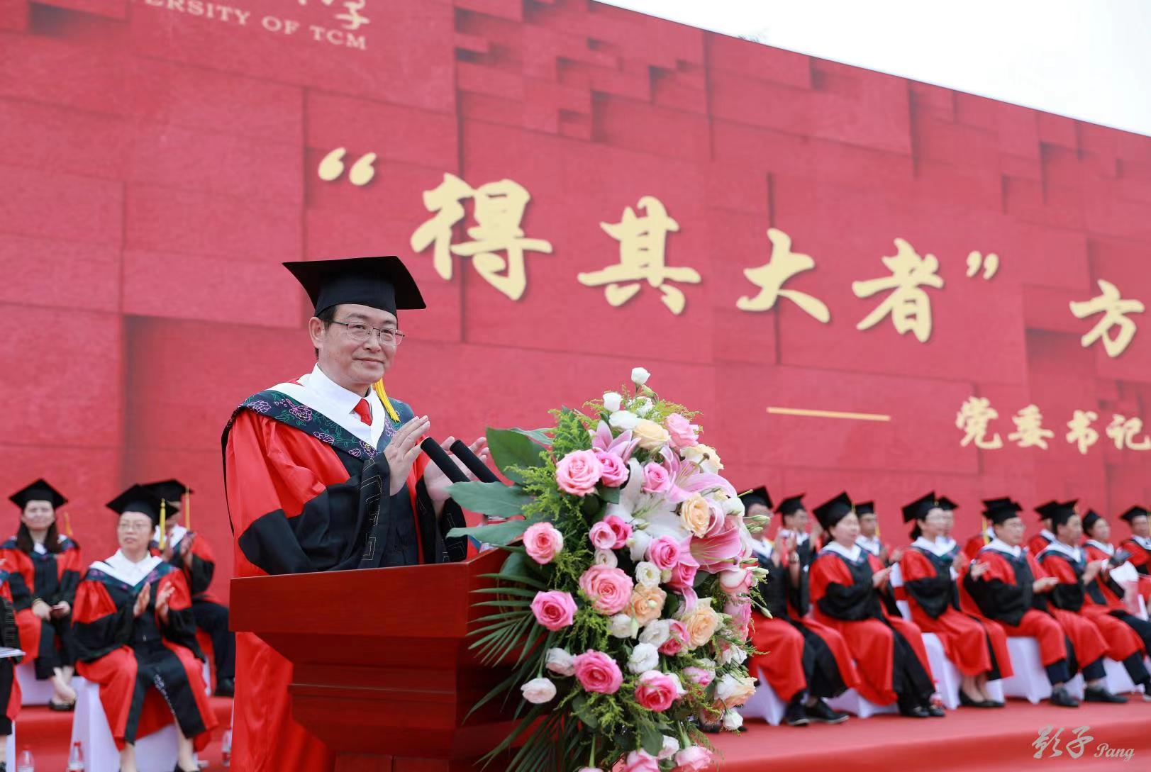 毕业典礼上,成都中医药大学党委书记刘毅以《“得其大者”方能“兼其小”》为题,引用杰出校友谢恬教授和李文娟的故事,阐释了何为“得其大”和“兼其小”。“得其大”就是要胸怀全局、眼观大局,将整个事业、整个人生的框架了然于心,“兼其小”就是要踏踏实实、兢兢业业地行稳致远。