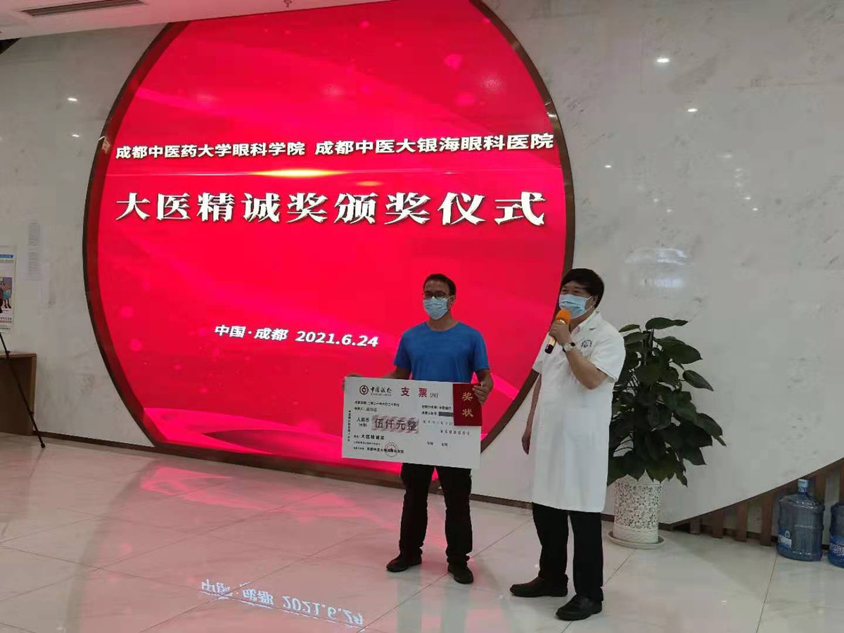 当天下午,成都中医药大学附属银海眼科医院(眼科学院)为吴伯达颁发了“大医精诚奖”,并给予了5000元奖金。“大医精诚奖”是从去年开始设立的,据院长段俊国表示,这个奖项将长期设立下去,对关键时候伸出援手的医学生、医生给予奖励,让这份大爱发扬光大。