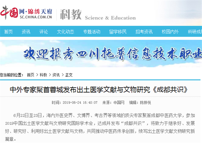 6月22日至23日,海内外医史界、文博界、考古界等领域的顶尖专家聚首成都中医药大学,参加2019中国出土医学文献与文物研究国际学术会,达成并发布“成都共识”,将致力于继承好、发展好、研究好、利用好出土医学文献与文物,共同推动中医药传承创新,续写出土医学文献文物研究新篇章。