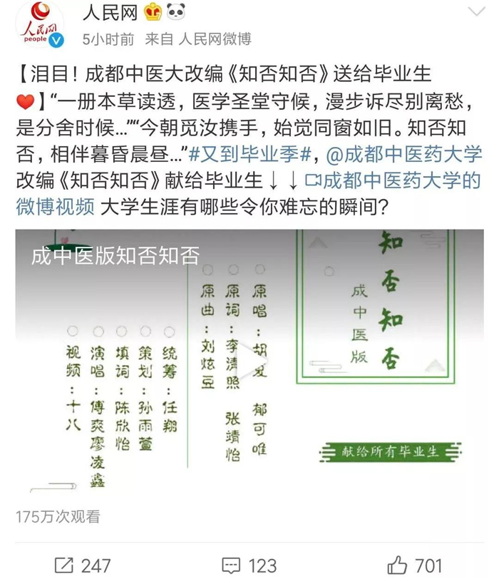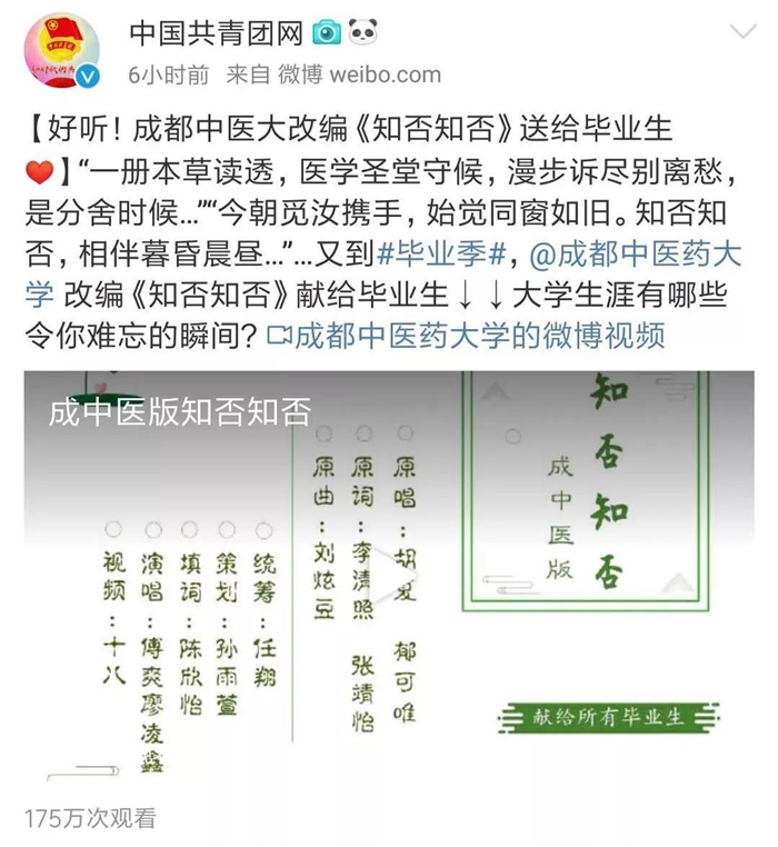 又到毕业离别时,学校里充满了浓浓的离别之情,老师、同窗、室友,以及校园里的花花草草都成了大家依依不舍的眷恋。近日,一首由成都中医药大学学生改编,送给毕业同学的《知否知否》就走红网络,被人民日报、中国共青团网等多家官方微博转发。该视频在短短6个小时中就吸引了170多万人次的观看量。