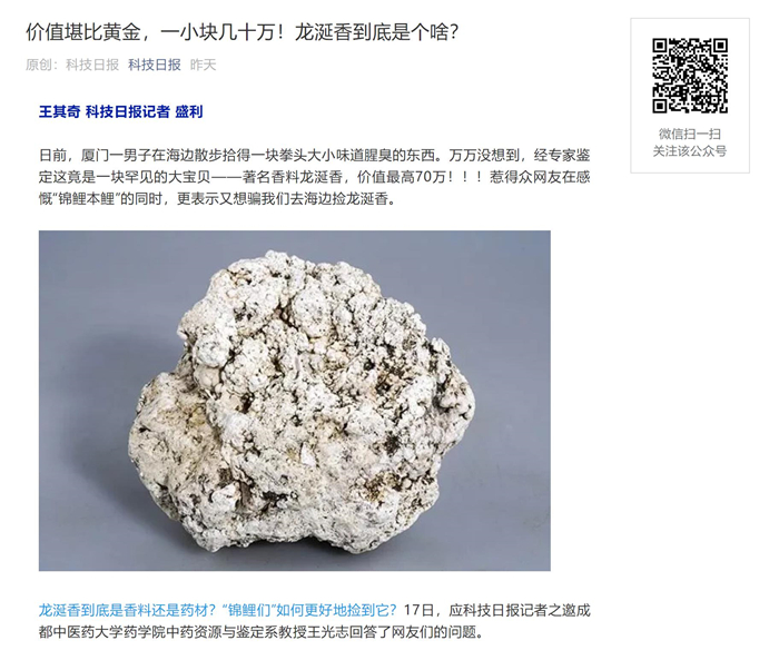 龙涎香到底是香料还是药材?“锦鲤们”如何更好地捡到它?17日,应科技日报记者之邀成都中医药大学药学院中药资源与鉴定系教授王光志回答了网友们的问题。