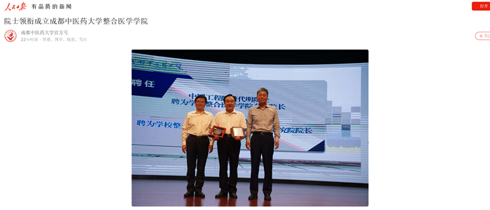 6月1日,成都中医药大学整合医学学院成立大会举行。中国工程院樊代明院士任学院名誉院长,中国工程院陈香美院士任学院院长,学校党委书记刘毅、校长余曙光向院士颁发聘书,标志着院士领衔的整合医学学院在四川正式成立。同时,樊代明院士还出任学校医学与生命科学院名誉院长,陈香美院士出任学校中西医结合研究院院长。成立大会由学校党委常委、副校长杨静主持。