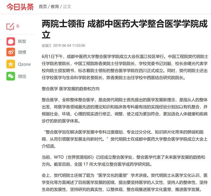 “整合医学旨在解决医学发展中专科过度细划、专业过分分化、知识碎片化带来的弊端和阻碍,从而引领医学发展走向新时代。”樊代明院士在成都中医药大学整合医学学院成立大会上介绍道。