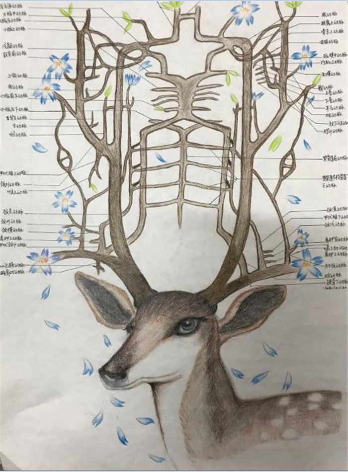 在这些作品中,《鹿角上的动脉》、《空弹》等作品都给朱鸿秋副院长留下了深刻的印象。她认为,利用鹿角的分叉来展现人体的动脉系统,将人体脊柱与大提琴结合在一起都足以见得学生想象力之丰富。将艺术与专业解剖结合,还带有一些夸张的色彩,这样就不是生硬的写实,也有很强的寓意在里面,对于学生来说是非常有意义的。