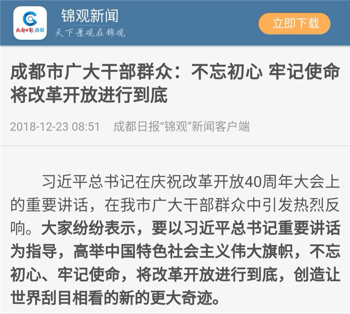成都市广大干部群众:不忘初心 牢记使命 将改革开放进行到底