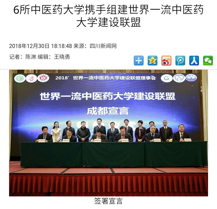 12月30日,2018世界一流中医药大学建设联盟理事会会议在成都召开。会上,来自北京中医药大学、上海中医药大学、广州中医药大学、南京中医药大学、天津中医药大学以及成都中医药大学在成都组建世界一流中医药大学建设联盟,共同探索符合中医药特色和规律的一流大学与一流学科建设之路,为健康中国、文化强国建设贡献中医药力量。