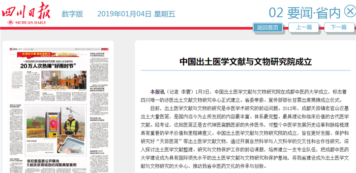 1月3日,中国出土医学文献与文物研究院在成都中医药大学成立,标志着四川唯一的涉医出土文献文物研究中心正式建立。省委常委、宣传部部长甘霖出席揭牌成立仪式。