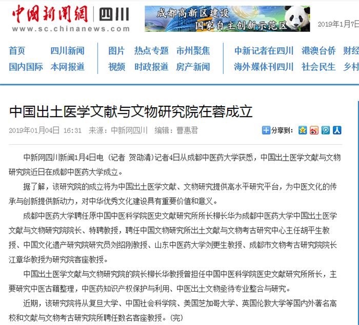 成都中医药大学聘任原中国中医科学院医史文献研究所所长柳长华为成都中医药大学中国出土医学文献与文物研究院院长、特聘教授,聘任中国文物研究所出土文献与文物考古研究中心主任胡平生教授、中国文化遗产研究院研究员刘绍刚教授、山东中医药大学刘更生教授、成都市文物考古研究院院长江章华教授为研究院客座教授。