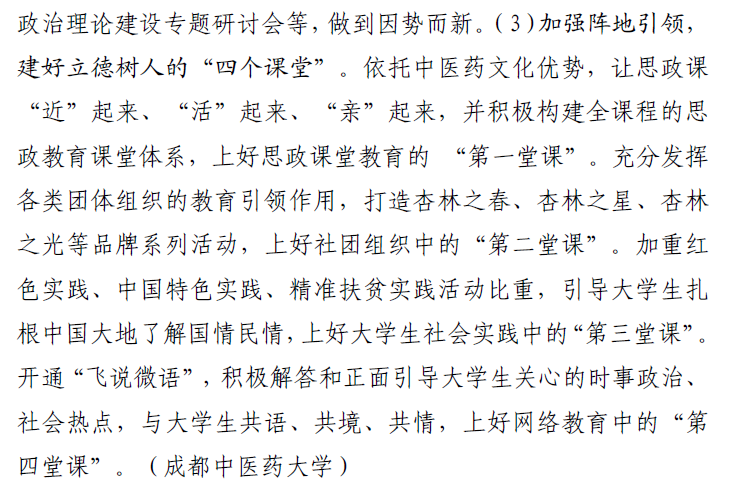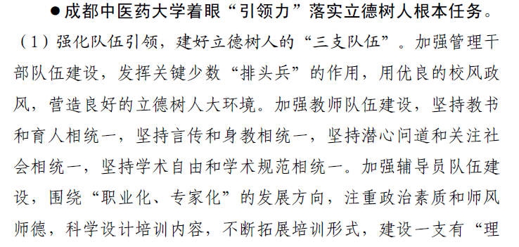 成都中医药大学着眼“引领力”落实立德树人根本任务。一、强化队伍引领,建好立德树人的“三支队伍”