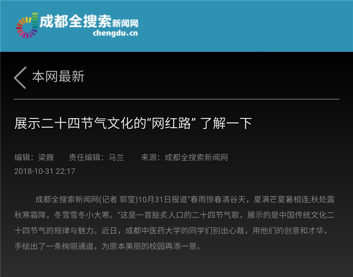 成都全搜索新闻网(记者 郭莹)10月31日报道“春雨惊春清谷天,夏满芒夏暑相连;秋处露秋寒霜降,冬雪雪冬小大寒。”这是一首脍炙人口的二十四节气歌,展示的是中国传统文化二十四节气的规律与魅力。近日,成都中医药大学的同学们别出心裁,用他们的创意和才华,手绘出了一条绚丽通道,为原本美丽的校园再添一景。