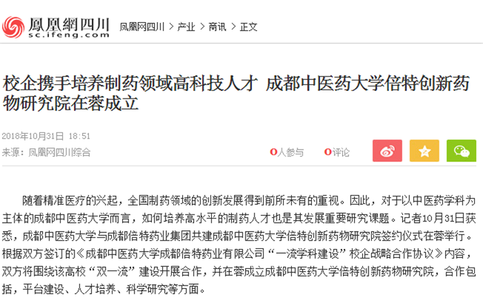 校企携手培养制药领域高科技人才 成都中医药大学倍特创新药物研究院在蓉成立