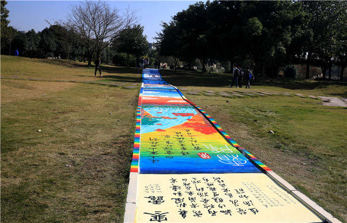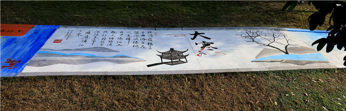 日前,一条横跨学校五行大草坪,长138米,宽1.6米的校园通道被学生华丽丽地改装成“二十四节气”文化主题大道,立即成为校园最吸睛的景点。主题大道被分作26块,由西向东,每个节气为一副独立的创意画,24个节气有序衔接,风格多变,内容精致,另有序言后记首尾呼应。