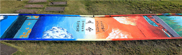 后勤基建处崔红芳老师对同学们的精心构思和细细描绘赞赏有加:“从‘阳和启蛰,品物皆春’立春,到‘征鸟厉疾,水泽腹坚’的大寒,他们运用水墨画、油画、书法等形式,施工笔、色块衔接、平涂等技法,融入民族文化、中医药文化、校园文化等元素,以靛青、钛白、湖蓝等简单的丙烯颜料,笔走春夏、细绘秋冬,勾勒出四季的轮回、万物的荣枯。”历经9天,所有版块完成创作,最后以清漆处理达到提亮和保护画面的功效。