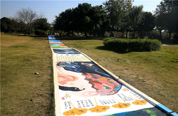 从高处俯瞰,主题大道就像一条鲜艳的彩带,为深秋的五行大草坪增添了一抹亮丽的色彩。行走于主题大道,十步一景,时节交替,领略艺术的风采,感受传统的魅力,心中别有一番满足。