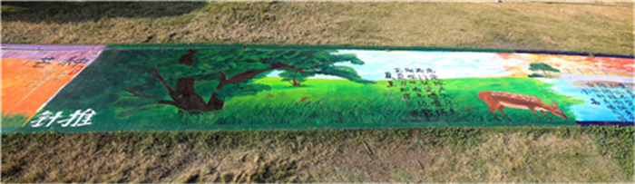 后勤基建处崔红芳老师对同学们的精心构思和细细描绘赞赏有加:“从‘阳和启蛰,品物皆春’立春,到‘征鸟厉疾,水泽腹坚’的大寒,他们运用水墨画、油画、书法等形式,施工笔、色块衔接、平涂等技法,融入民族文化、中医药文化、校园文化等元素,以靛青、钛白、湖蓝等简单的丙烯颜料,笔走春夏、细绘秋冬,勾勒出四季的轮回、万物的荣枯。”历经9天,所有版块完成创作,最后以清漆处理达到提亮和保护画面的功效。