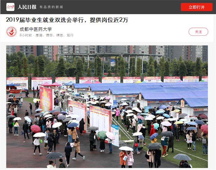 11月17日,成都中医药大学2019届毕业生就业双选会在该校温江校区体育场举行,600余家用人单位参会,开展现场宣讲100余场,为5000余毕业生提供就业岗位19000多个。