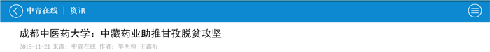 2018年1月,成都中医药大学与甘孜州签订中藏药业科技扶贫合作框架协议,筛选出“仁青蒂达芒觉”藏药制剂开发研究、健康食品“芫根”系列产品开发、藏药新药“查觉尼谷”研发等9个合作项目。目前,9个合作项目中有4个项目已启动。