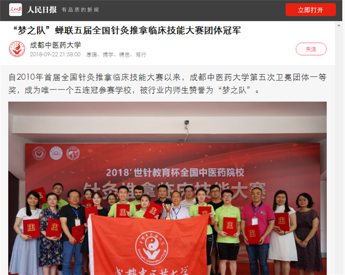 自2010年首届全国针灸推拿临床技能大赛以来,成都中医药大学第五次卫冕团体一等奖,成为唯一一个五连冠参赛学校,被行业内师生赞誉为“梦之队”。
